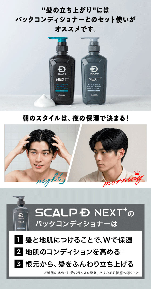 シャンプー後にはパックコンディショナーの使用を推奨しております。髪と地肌に使用することで、髪ダメージや地肌の乾燥をケアすることはもちろん、シャンプー同様の成分が髪を補強し、根元からふんわり立ち上げます。